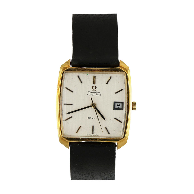 Omega orologio da uomo in oro giallo con cinturino in pelle di forma squadrata e' animato da movimento meccanico a carica automatica quadrante argente' con datario ad ore 3 secondi continui al centro indici a barretta cinturino in pelle e fibbia originale in metallo dorato.