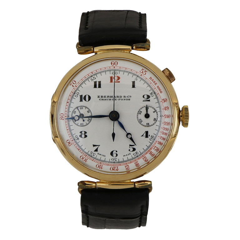 Eberhard raro orologio da uomo in oro giallo con funzione di cronografo monopulsante cassa a cipolla con anse snodate e fondello a cerniera quadrante in porcellana bianca due contatori scala tachimetrica periferica rossa e minuteria nera indici a numeri romani.