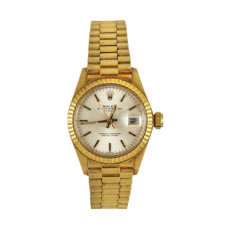 Rolex orologio da donna modello Datejust in oro giallo bracciale President quadrante argente' soleil indici a bastone e datario a ore 3 vetro plastica con lente ciclope.