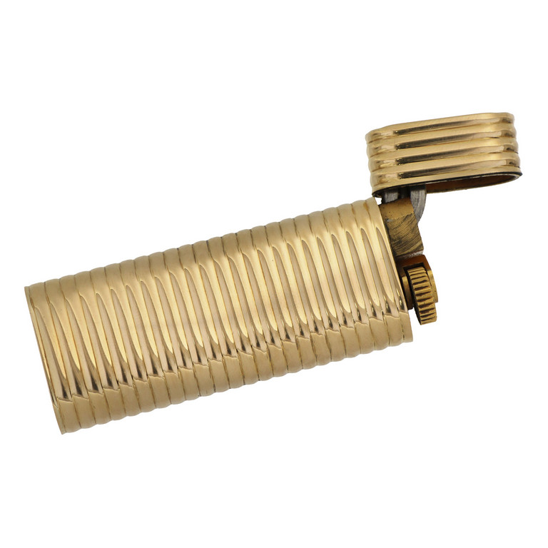 CARTIER accendino ricoperto da lamina in oro giallo massiccio lavorato a coste rotonde perfettamente funzionante dimensioni 7 x 2 5 x 1 3 cm.