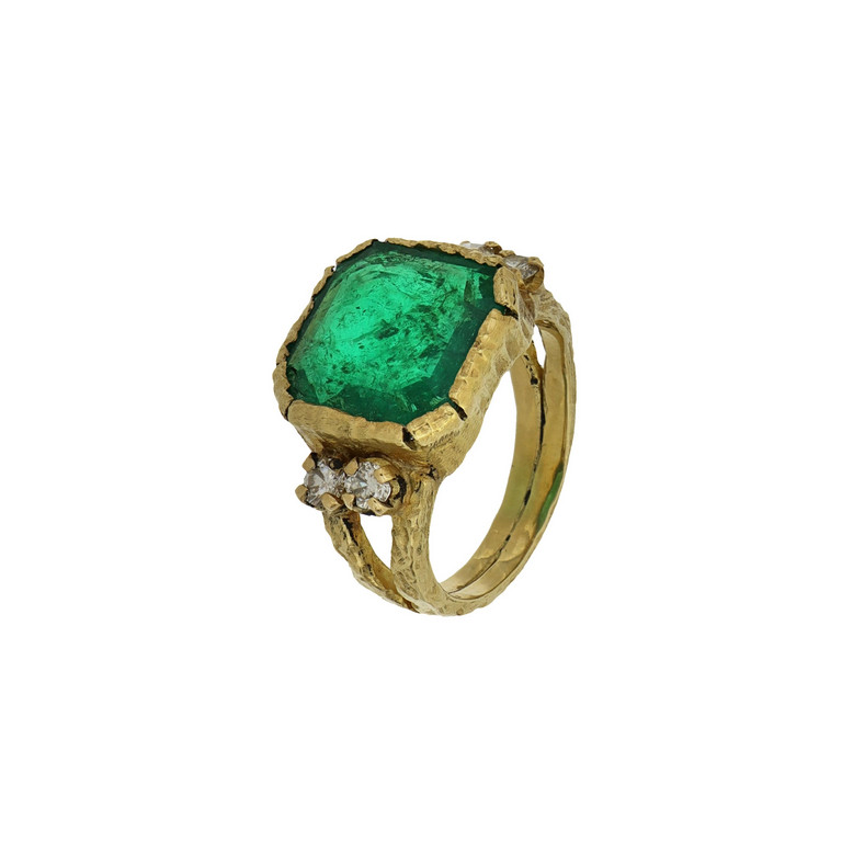 SFORZA anello in oro giallo con smeraldo taglio quadrato al centro di stimati ct. 3 5 e diamanti ai lati per ct. 0 30 ca.