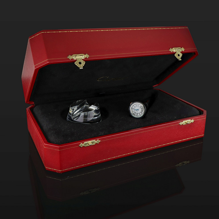 CARTIER penna-orologio da scrivania con supporto di cristallo in perfette condizioni e con astuccio originale il movimeto elettromeccanico perfettamente funzionante e il refil nuovo.