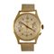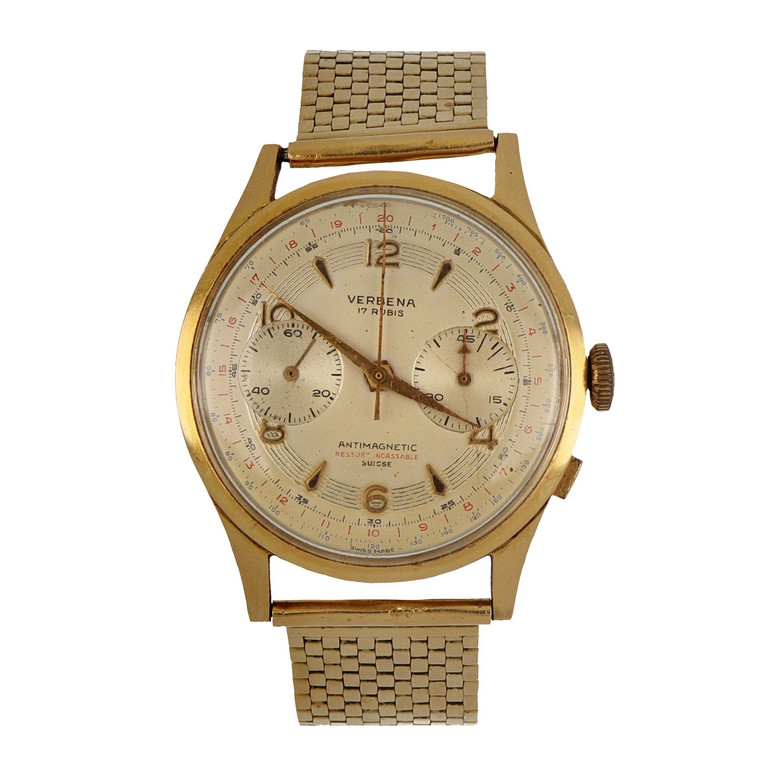 VERBENA - Orologio meccanico a carica manuale in oro giallo con bracciale in oro a maglia lamè funzione cronografica tasti laterali rettangolari (uno mancante). Vetro plastica indici arabi e cuneiformi.