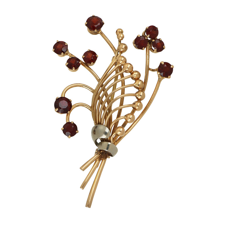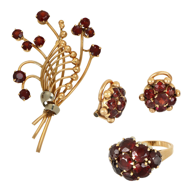 Demi parure in oro giallo composta da anello orecchini a clips senza perno e spilla granati taglio rotondo a impreziosire la lavorazione a motivi floreali.