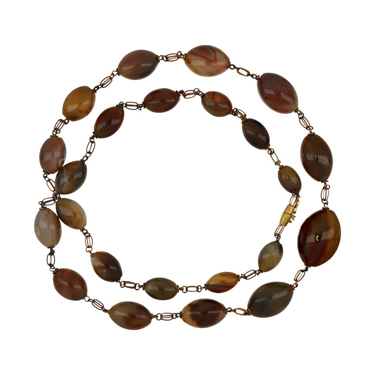 Inusuale collana di corniole tagliate ad olive scalari intercalate da nodi in oro giallo ossidato chiusa da un barilotto satinato con sicurezza.