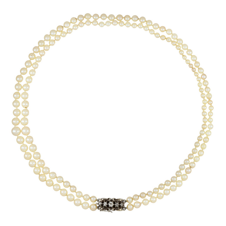 Collana di perle coltivate a doppio filo da 8 00 a 4 30 mm con chiusura in oro bianco e diamanti di taglio antico.