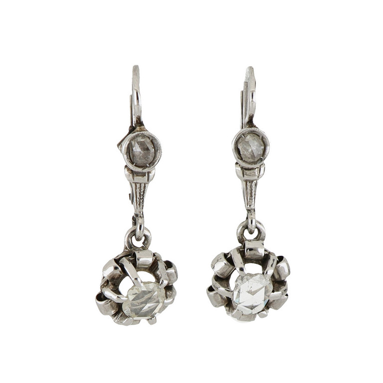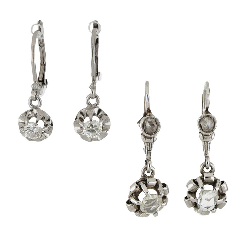 Lotto composto da due paia di orecchini in oro bianco a monachella un paio con diamanti taglio antico per complessivi ct. 0 45 ca. ed uno con diamanti taglio rosa per complessivi ct. 0 30 ca.