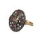 Anello gotico di forma ovale in oro giallo e argento al centro Croce di Malta stilizzata con rubini taglio cabochon piccoli diamanti taglio rosa ai lati.