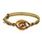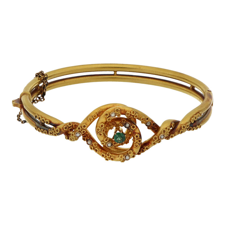 Bracciale semirigido in oro giallo realizzato con antica lavorazione a canna vuota al centro piccolo smeraldo ottagonale e perline.