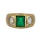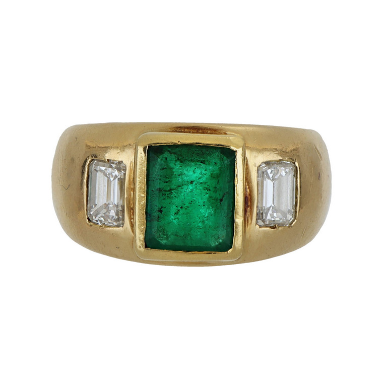 Anello a fascia bombata in oro giallo con smeraldo centrale colombiano di circa 1 90 ct e due diamanti laterali di forma rettangolare taglio a gradini di circa 0 60 ct complessivi.