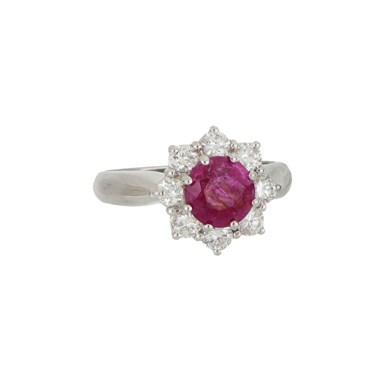Anello a margherita in oro bianco al centro rubino di 1 93 ct di forma rotonda taglio misto accompagnato da certificato gemmologico del dott. Giulio Provera attestante l'origine birmana e l'assenza di trattamento termico. Completano l'anello 8 diamanti di forma rotonda taglio a brillante per stimati 1 ct circa.