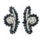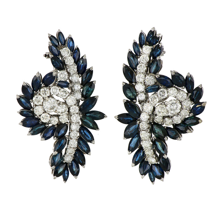 Eleganti orecchini in oro bianco zaffiri taglio navette per stimati ct.10 0 contornano un nodo tempestato di diamanti taglio brillante per stimati ct. 4 5.