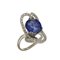 Anello in oro bianco ad intreccio con grande zaffiro centrale di stimati 5 60 ct e diamanti tondi taglio a brillante a decorare la struttura.