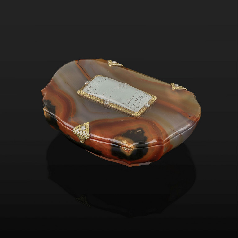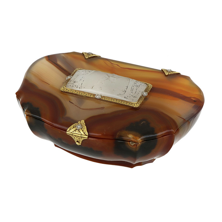 Elegante e finissima scatola in quarzo variegato cerniere chiusura e decoro in oro giallo delicatamente inciso e incassato con piccoli diamanti.