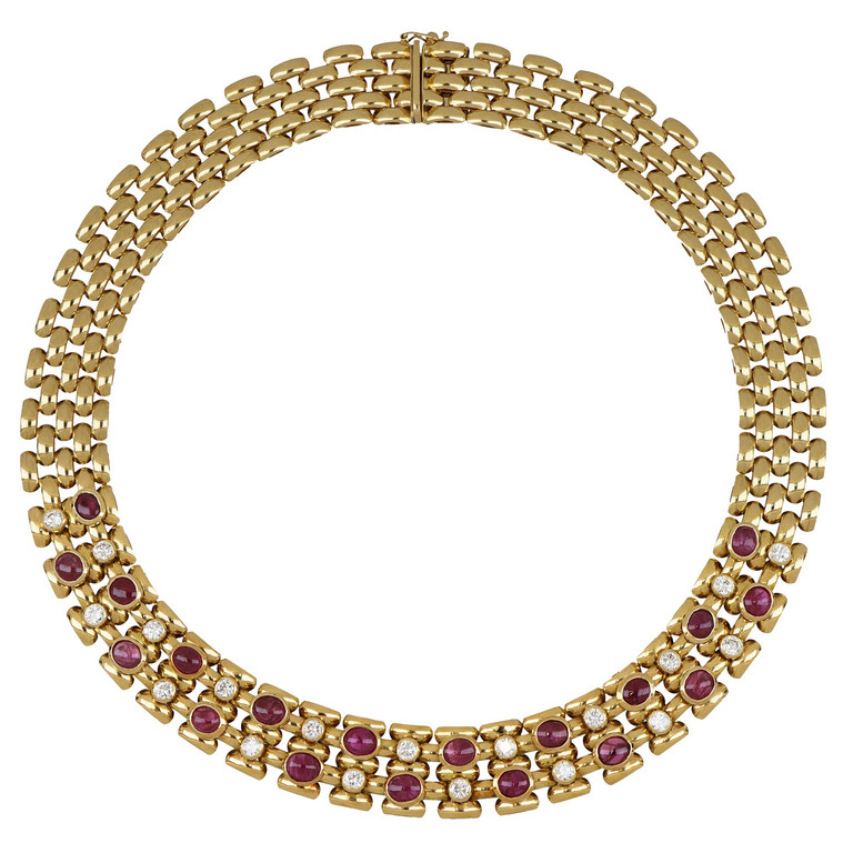 Collier in oro giallo a maglia snodata due file di rubini taglio cabochon ct. 15 ca. e diamanti taglio brillante ct. 1 70 ca. si alternano nella parte centrale.