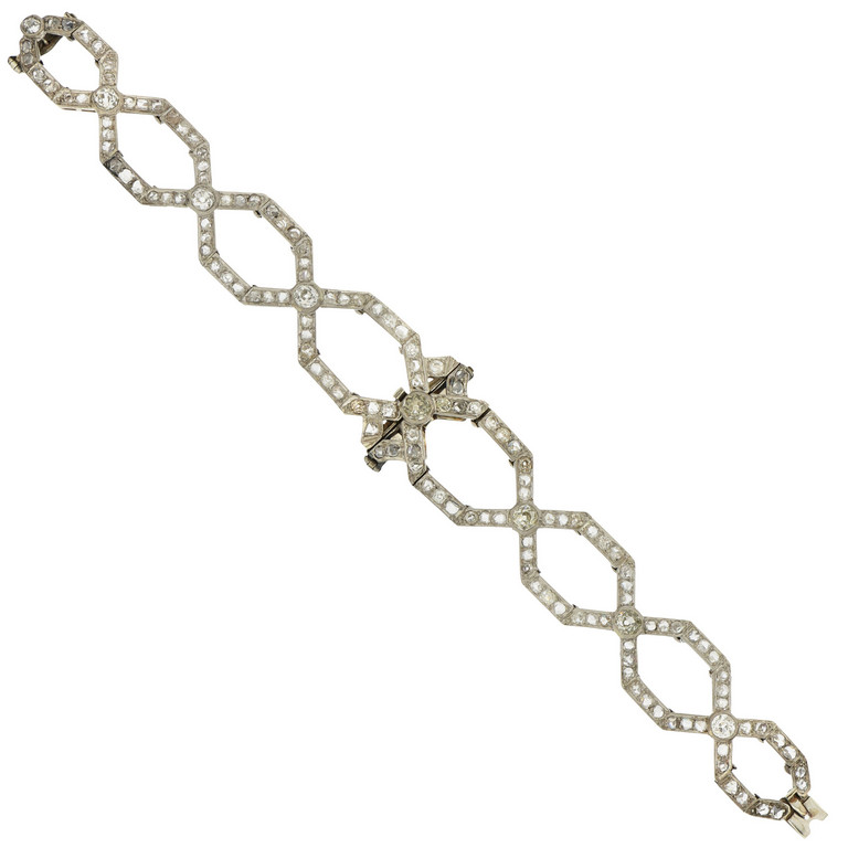 Raffinato bracciale d'epoca primo decò in platino smontabile con diamanti di taglio antico e tagli a rosa per stimati 6 50 ct complessivi.