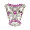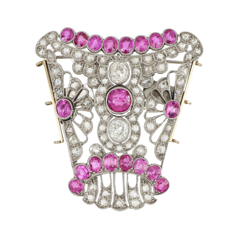 Elegante chiusura per collana multifilo in platino e oro bianco forma vagamente trapezioidale rovesciata e curvata al collo luminosi zaffiri HotPink per ct. 7 0 ca probabilmente birmani e non riscaldati diamanti di taglio oldmine per ct. 3 5 ca. ornano il delizioso traforo anni '30.