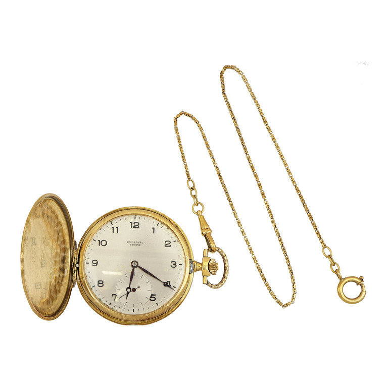 Universal Geneve orologio da taschino doppia cassa in oro giallo quadrante argente' con numeri arabi piccoli secondi a ore 6 con catena da panciotto.
