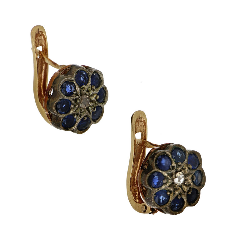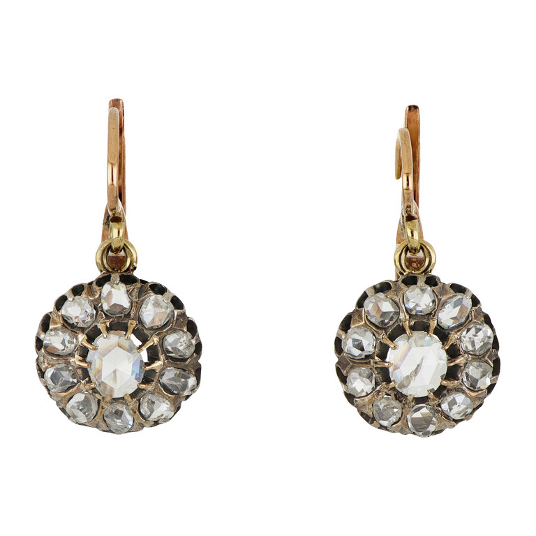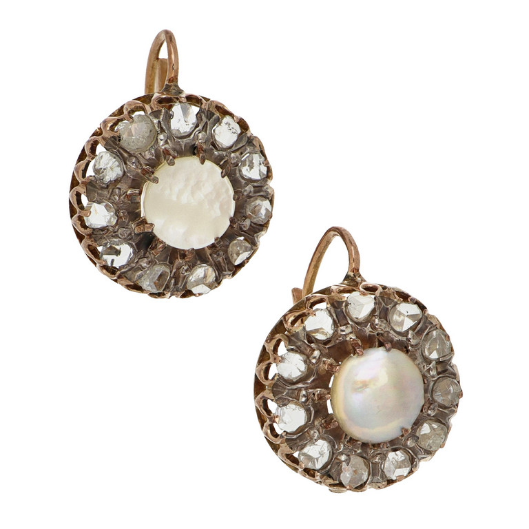 Lotto composto da tre paia di orecchini a monachella in oro e argento di antica manifattura impreziositi con diamanti taglio rosa piccoli zaffiri e perle mabe'.