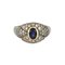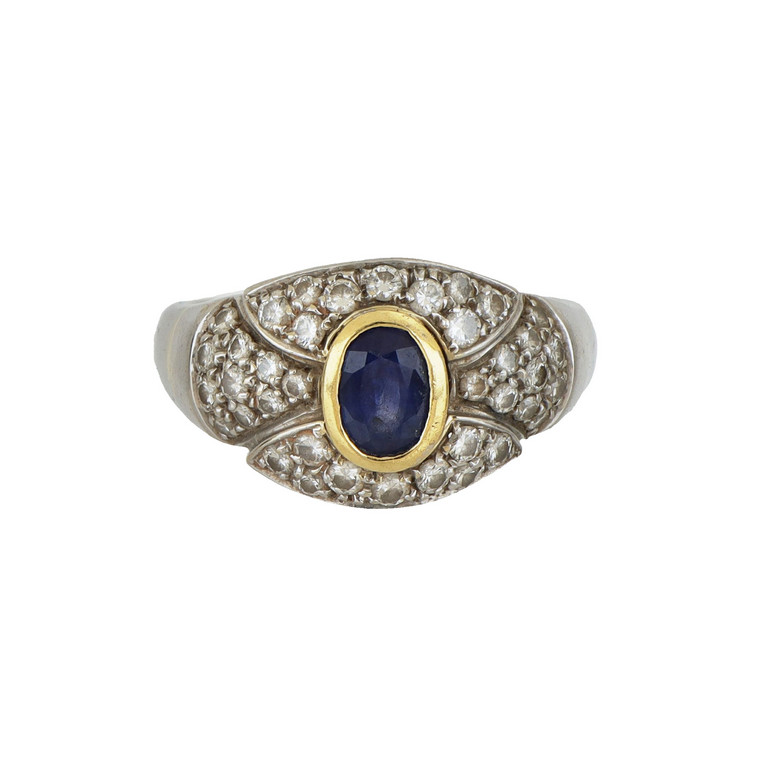 Anello in oro bianco con zaffiro ovale e piccoli diamanti incassati a pavè.