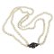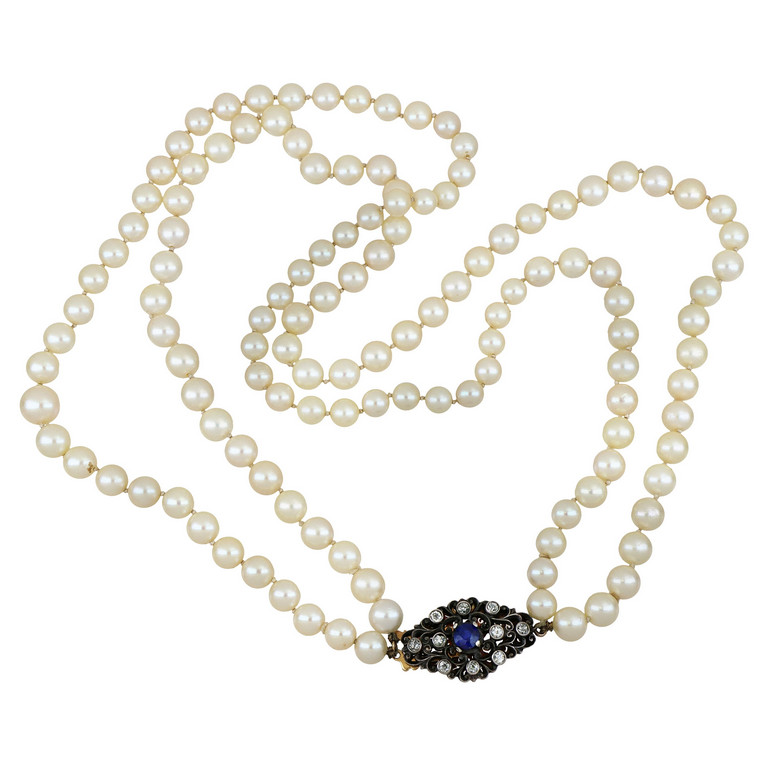 Collana di perle coltivate a doppio filo diametri circa 8 mm. con chiusura in oro rosso e argento con zaffiro naturale centrale di circa 1 15 ct stimati e 10 diamanti di taglio antico.