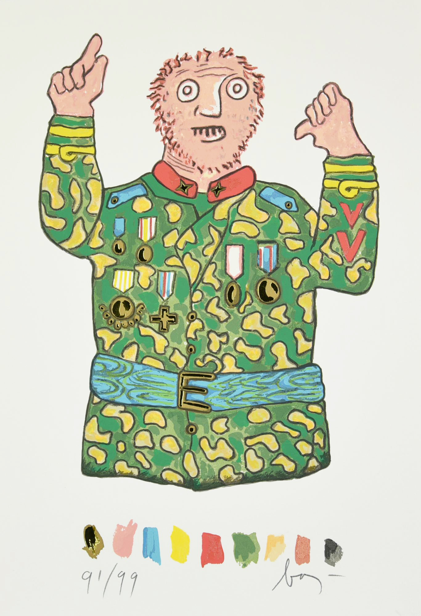 cartella contenente testo di presentazione di Roberto Sanesi e una serigrafia polimaterica di Enrico Baj, cm 50x35; es. 91/99