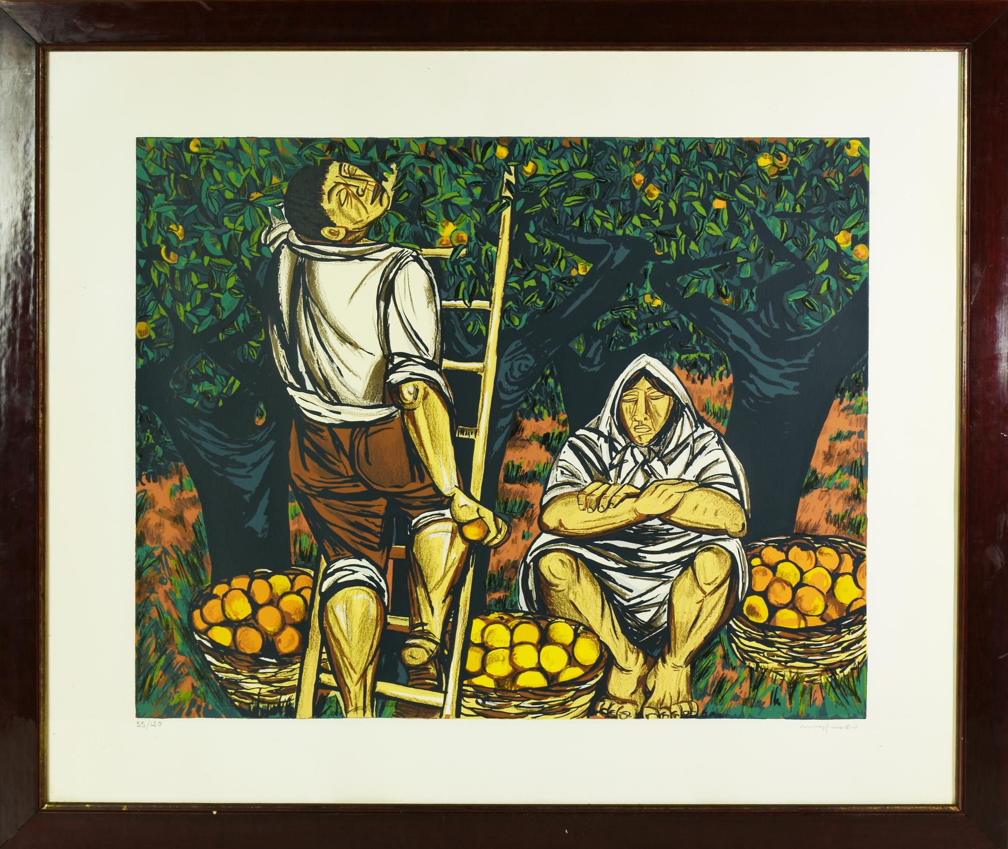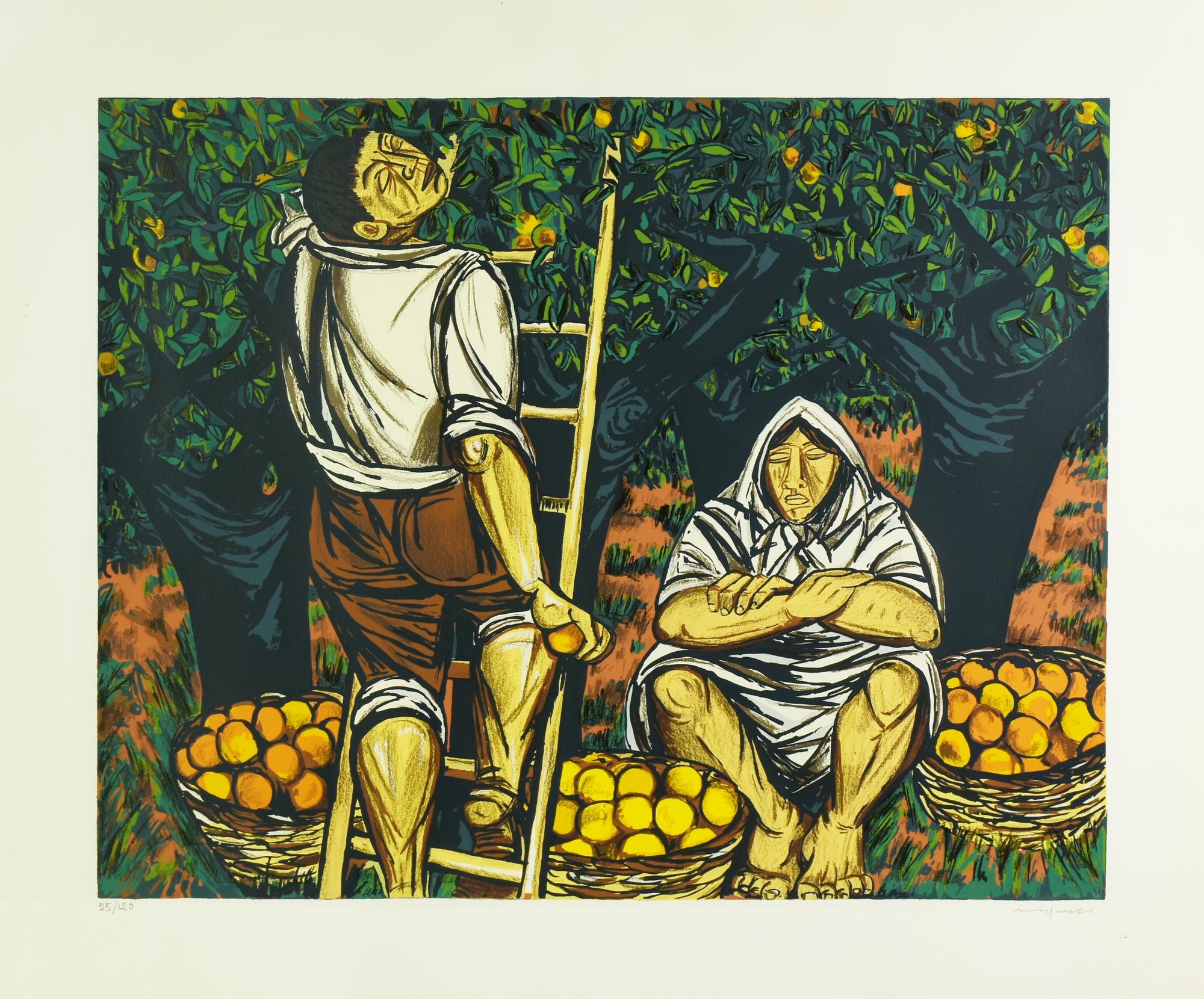 Giuseppe Migneco (1908 - 1997) LA RACCOLTA DELLE ARANCE serigrafia, cm 60x70;...