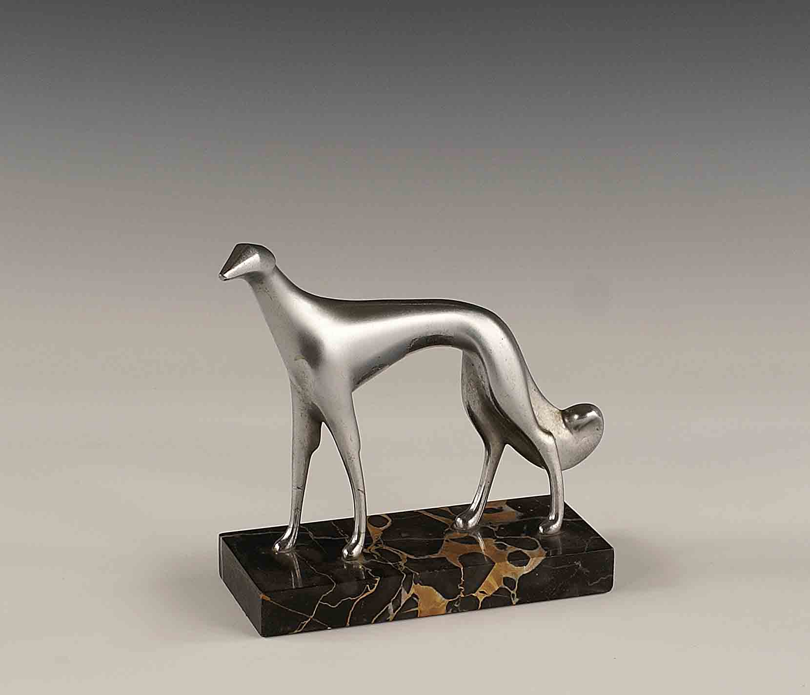 Scultura Decò raffigurante levriero in metallo poggiante su base rettangolare...