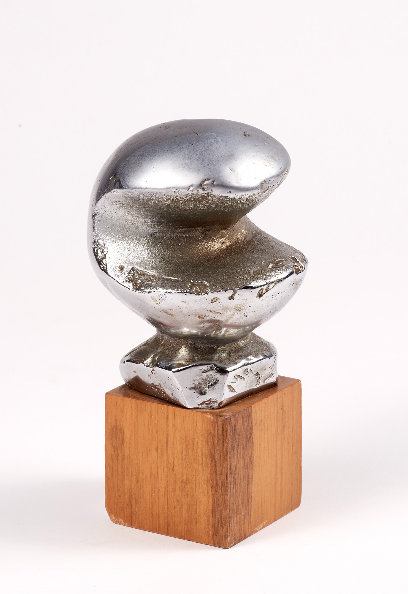 Scultura in metallo cromato su base in legno, multiplo