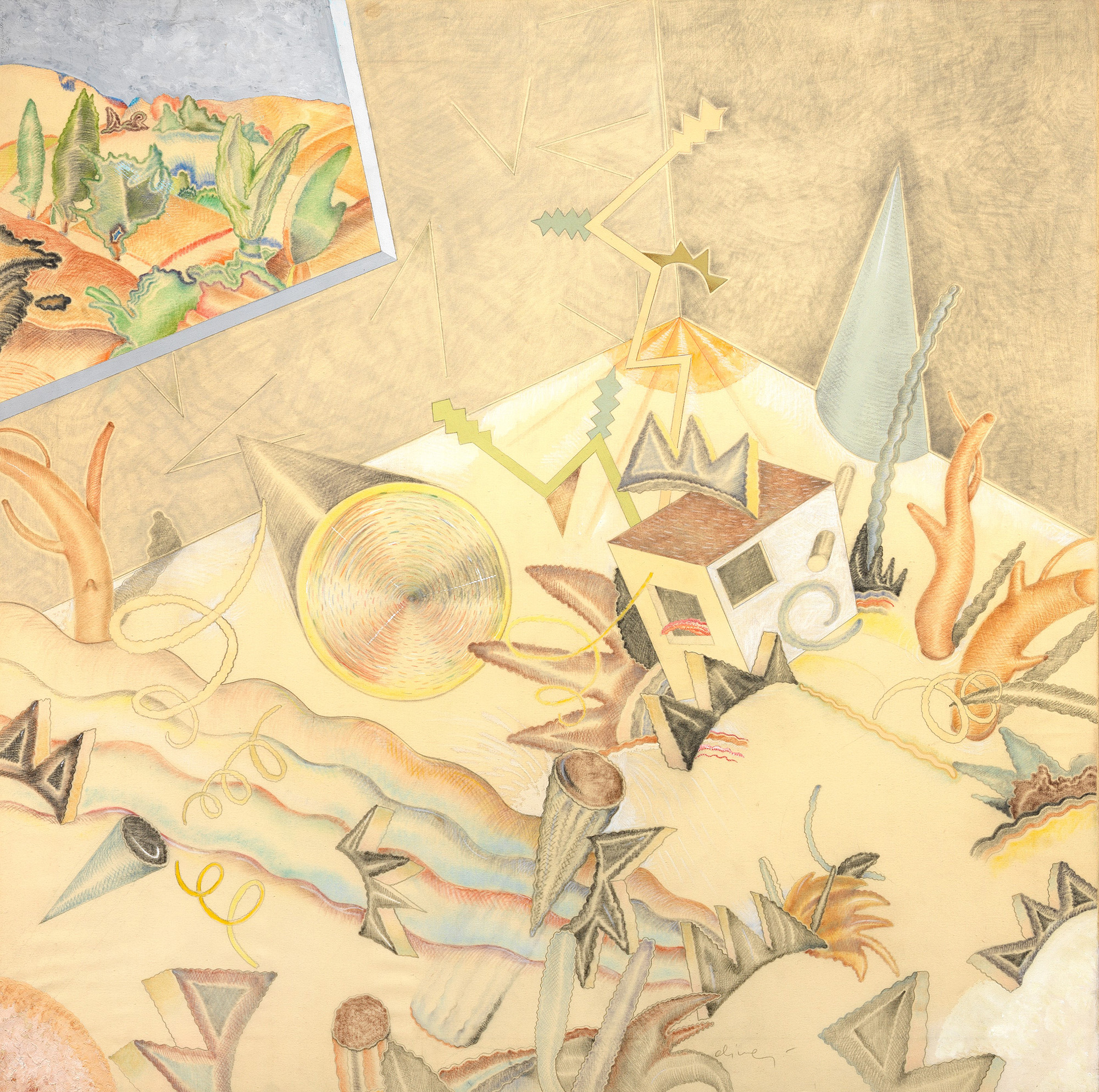 Firma in basso al centro: Alinari; titolo al verso sul risvolto della tela: Paesaggio interiore; titolo e firma sulla tela: Paesaggio interiore / Alinari.