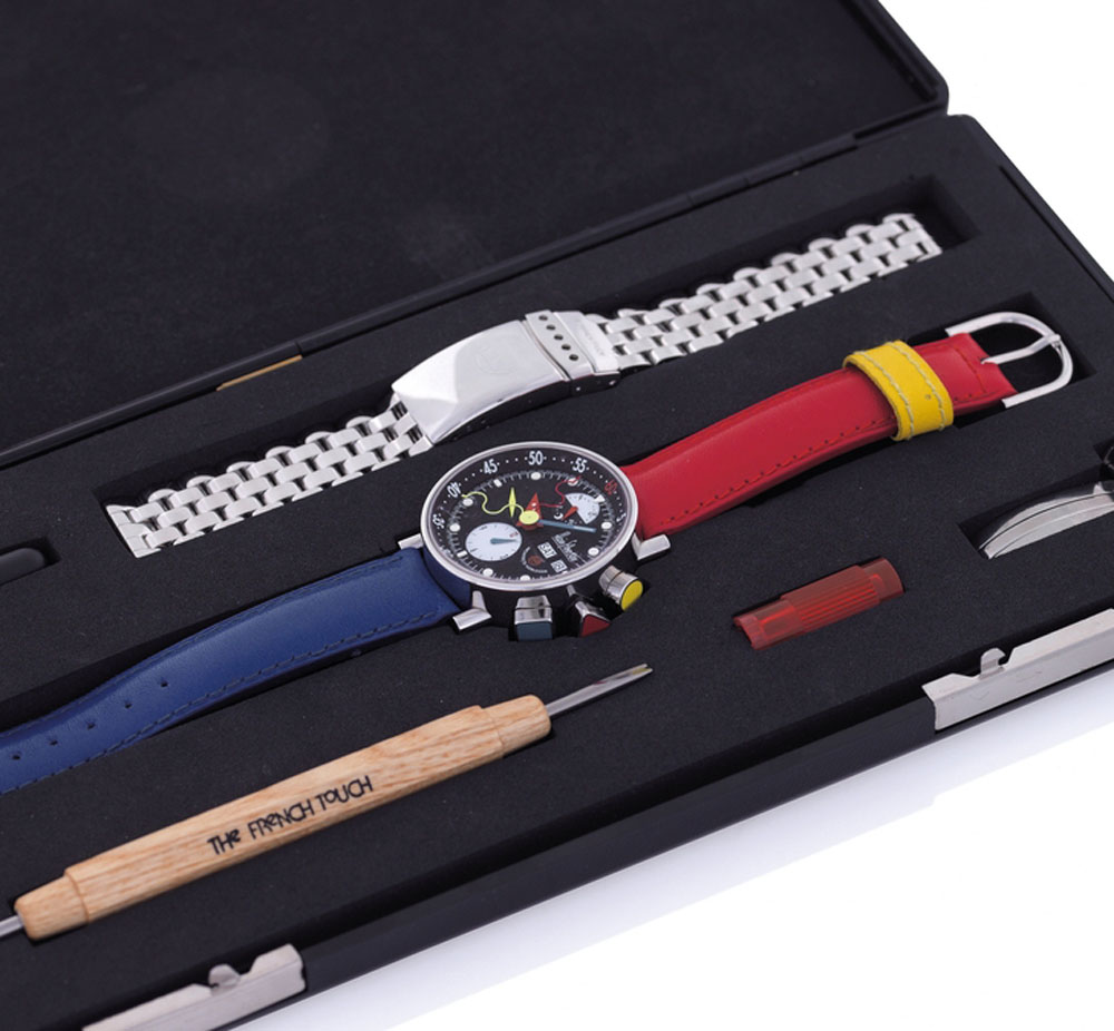 Diam. mm 40. C. stainless steel, transparent screwed case back, sapphire crystals, round and square-shaped buttons, triangular crown (as new). D. black with luminous indexes, central minute recorder and 12 hour register, seconds at 9 and 24 hours with night/day division at 12, aperture for day and date at 12 (as new). M. self-winding (very good). Dial and movement signed. Accompanied by Alain Silberstein strap and stainless steel buckle, deployant clasp and stainless steel bracelet, box and certificate.