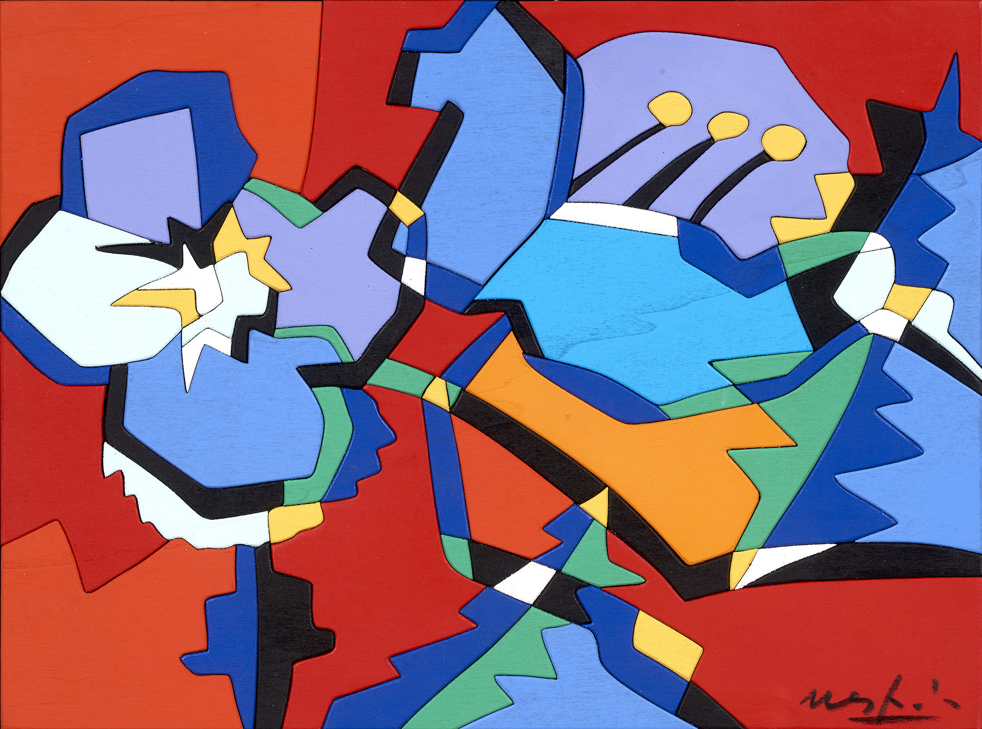 Firma in basso a destra: Nespolo; titolo e firma al verso: Flora / Ugo Nespolo: dichiarazione di autenticità: Autentico / Ugo Nespolo: timbro a fuoco Nespolo: timbro Galleria Quarto Platano, Forte dei Marmi.