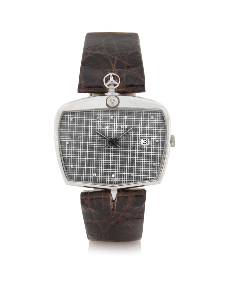Dim. mm. 39x20. C. Shaped as the radiator of Mercedes car, 18K white gold, with double emblem (very good). D. grey, with grid design with applied indexes, centre seconds and date at 3 (very good). M. self-winding (very good). Dial and movement signed, case numbered.