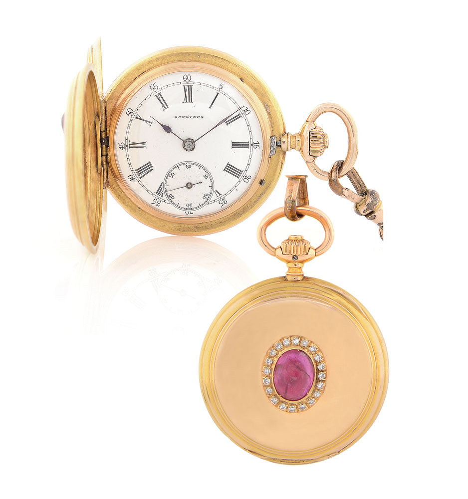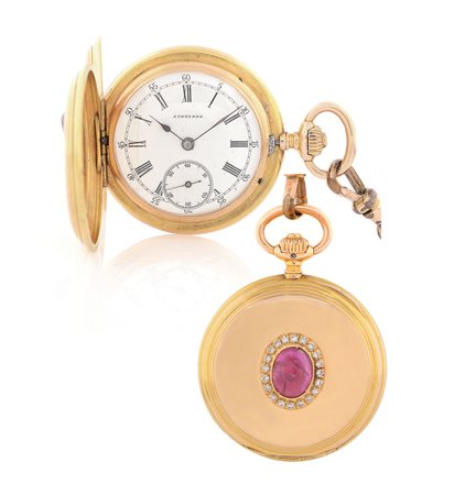Tripla cassa n. 550731 in oro rosa 18 kt, sul fronte miniatura incisa raffigurante paesaggio con barca a vela e diamanti, il retro centrato da pietra rossa cabochon contornata da diamanti (ottimo). Quadrante in smalto con numeri romani e secondi al 6 (originale, ottimo). Movimento con scappamento ad ancora, chiuso per 3/4, carica manuale (ottimo). Quadrante e movimento firmati, cassa numerata. Completo di piccola chatelaine in princisbecco a molteplici fini catenelle e terminante con sigillo.