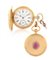 Diam. mm 36. C. hunter case, 18K pink gold, front with engraved landscape and back with ref cabochon stone and diamond (very good). D. white enamel with painted Roman numerals, subsidiary seconds (original, very good). M. anchor escapament, rhodiun-finished, keyless dress (very good). Small pinchbeck chatelain made by fine chains and seal.