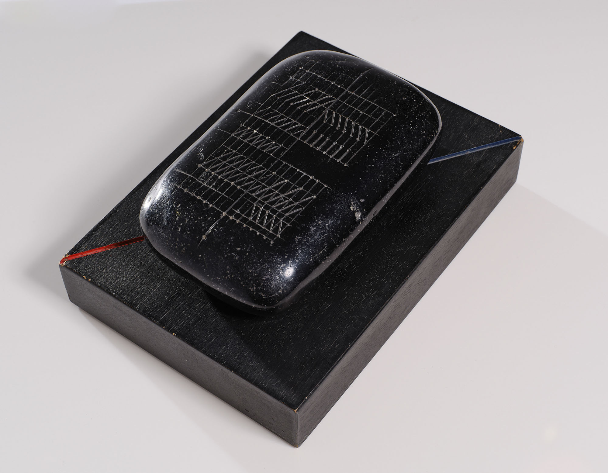 Scultura in pietra incisa su base in legno, cm. 9,5 x 24,5 x 18