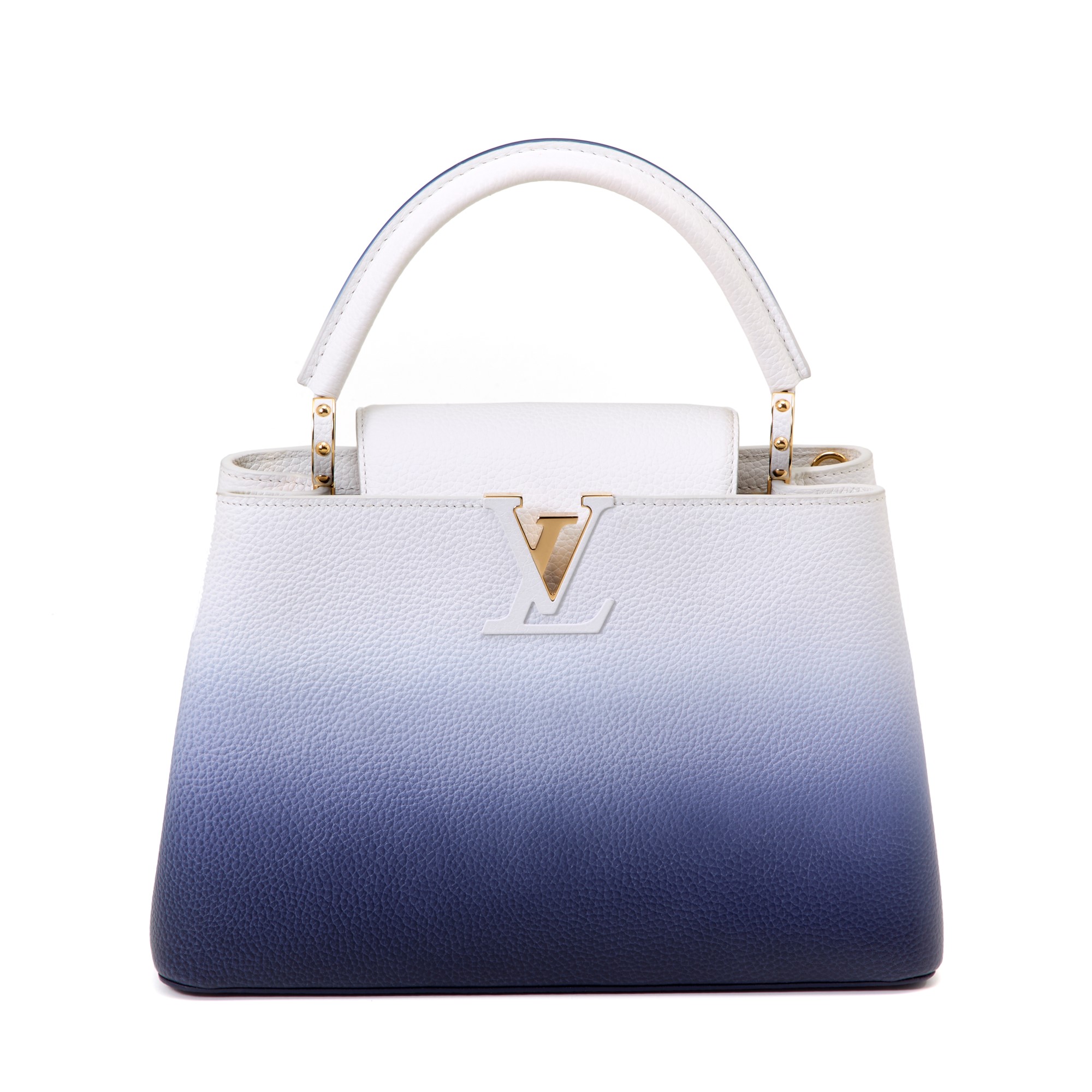 Louis Vuitton collezione Capoucine in pelle taurillon colore degradè sfumato bianco e azzuro con rifiniture dorate. Tracolla amovibile e regolabile in pelle bianca e rifiniture dorate. Due scomparti interni con tasca, chiusura a zip. Corredata di dustbag e card originale. Nuova.