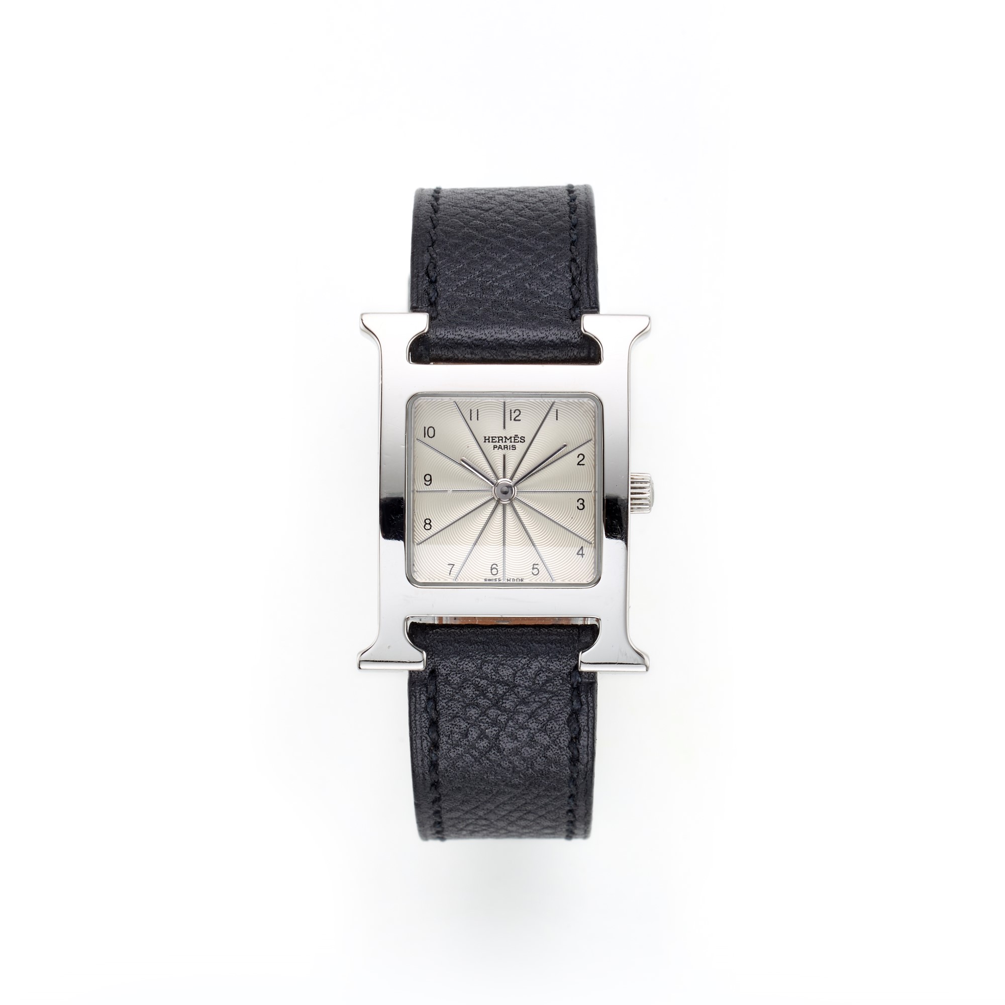 Hermes Heure H, anni 2000. Cassa in acciaio, con cinturino in pelle nera e fibbia ad ardiglione originale. Movimento al quarzo. Buone condizioni generali. Quadrante, movimento e cassa firmati.