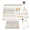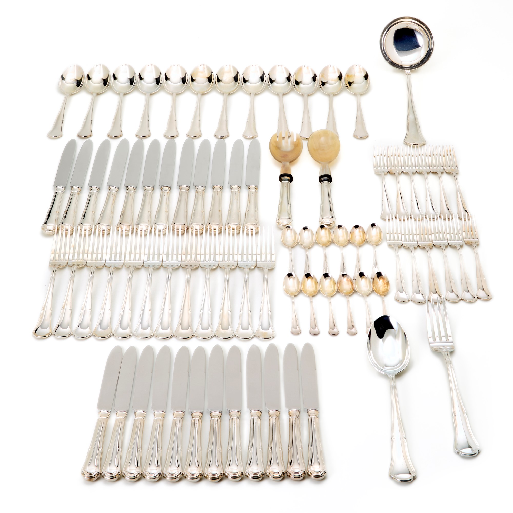 Servizio di posate in argento composto da: dodici coltelli grandi e piccoli, dodici forchette grandi e piccole, dodici cucchiai grandi e piccoli, un mestolo, un cucchiaio e forchetta da portata e posate da insalata con parti in osso