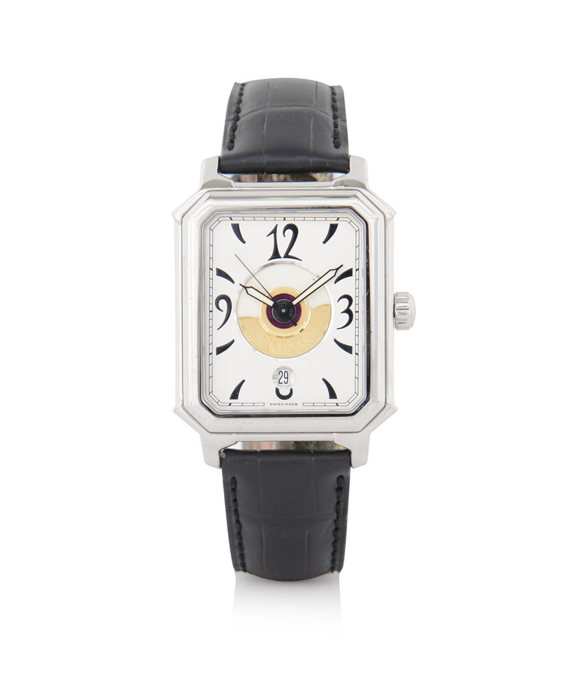 Cassa rettangolare in acciaio con semi-oblò sul fondello chiuso da viti e vetro zaffiro (come nuovo). Quadrante argentato con indici e numeri arabi smaltati, secondi al centro, data al 6 e rotore centrale girevole (ottimo). Movimento a carica automatica (ottimo). Quadrante, cassa e movimento firmati. Completo di cinturino, fibbia in acciaio, astuccio e certificato.