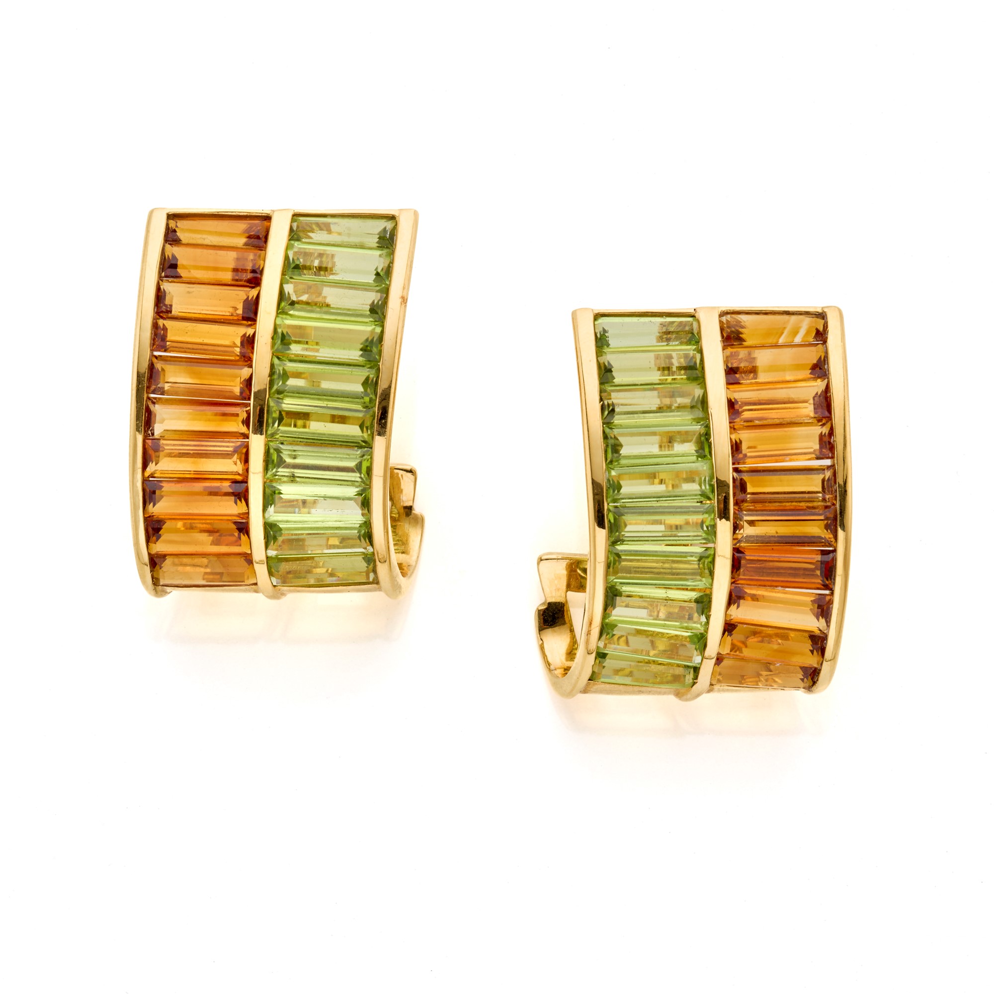 Orecchini firmati Sabbadini in oro giallo 18 Kt con peridoti rettangolari per complessivi 20 ct circa e quarzi rettangolari per complessivi 13,50 ct circa