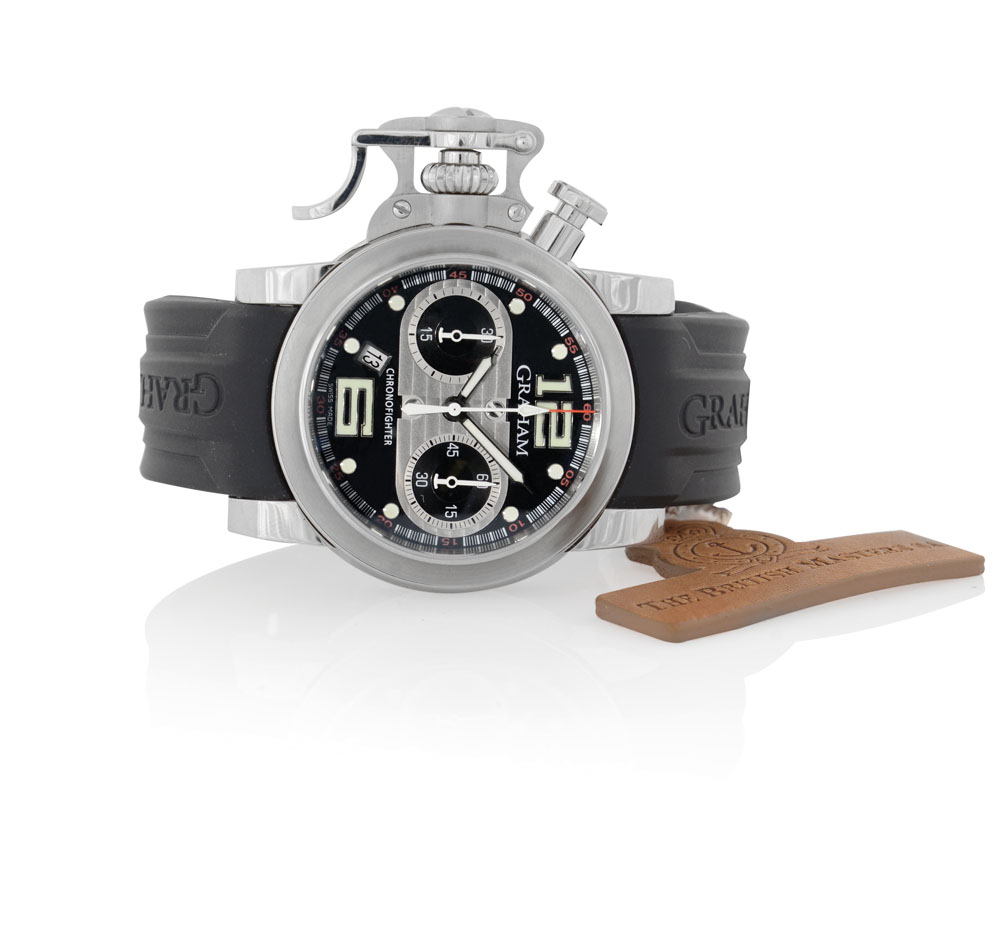 Diam. mm 43. C. stainless steel with transparent case back secured by screws, button through the crown with push lever, round button at 10, sapphire crystal (as new). D. black with luminous indexes, Arabic numerals and hands, 30 minutes register and date at 7 (as new). M. self-winding (as new). Dial, case and movement signed. Accompanied by Graham rubber strap, stainless steel buckle, box and certificate.
