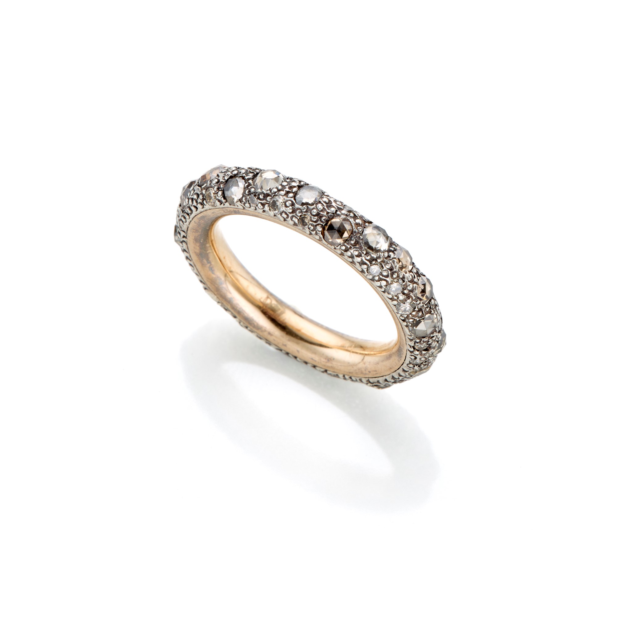 Anello fimato Pomellato, collezione Tango, in oro giallo 18 Kt e argento con diamanti mezza rosetta fancy