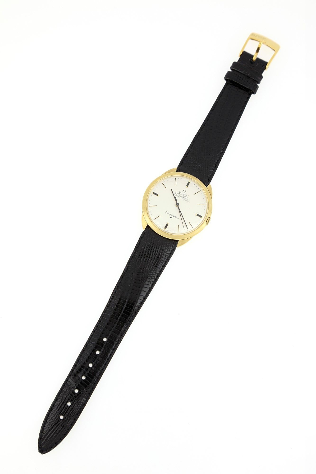 Omega Constellation Ref. 168.009 anni '70. Cassa in oro giallo 18 Kt, cinturino in lucertola. Movimento a carica automatica. Cassa, quadrante e movimento firmati. Ottime condizioni. Cassa 34,5 mm
