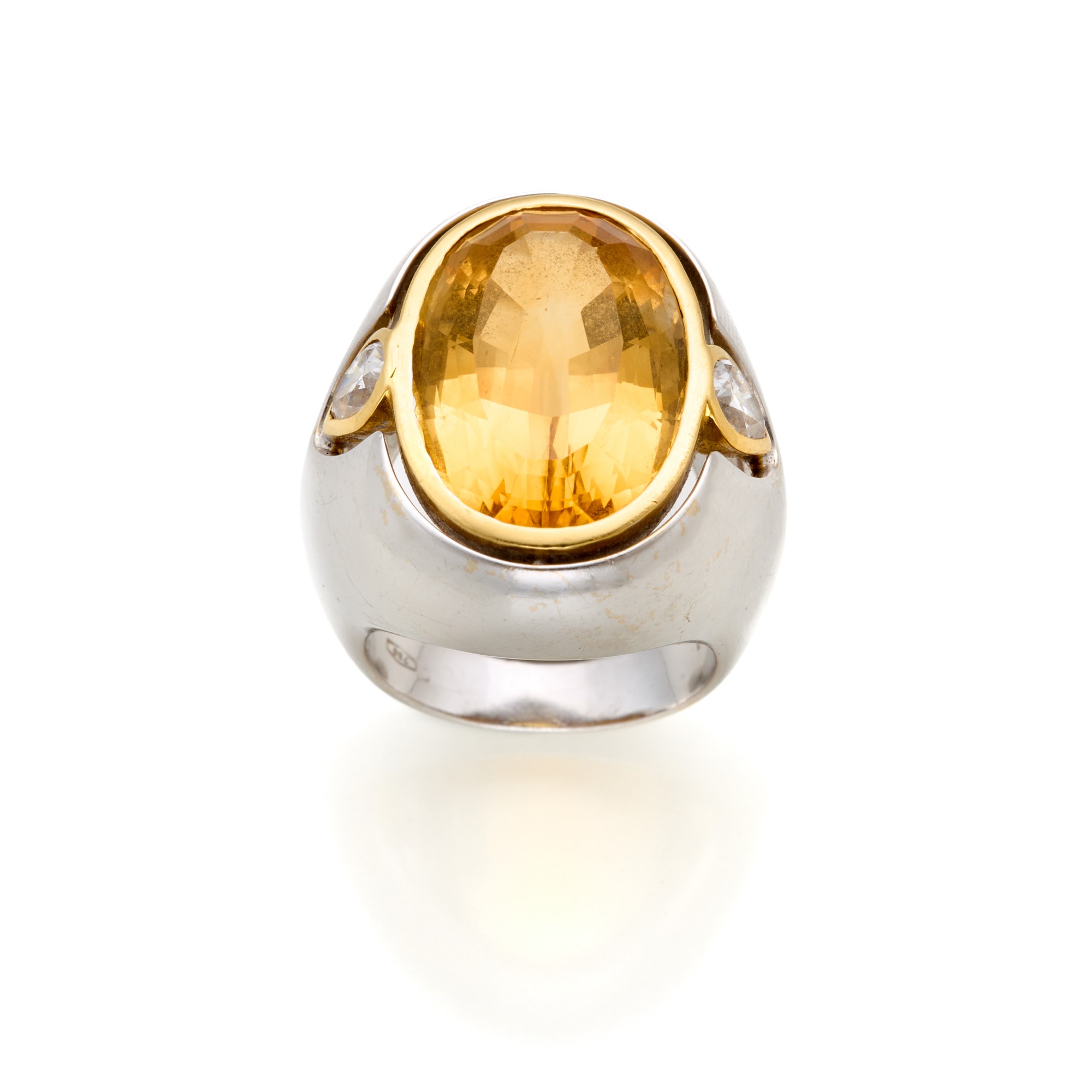 Anello firmato Antonini in oro giallo e bianco 18 Kt con quarzo citrino di circa 14,80 ct e due diamanti a goccia per complessivi circa 0,60 ct