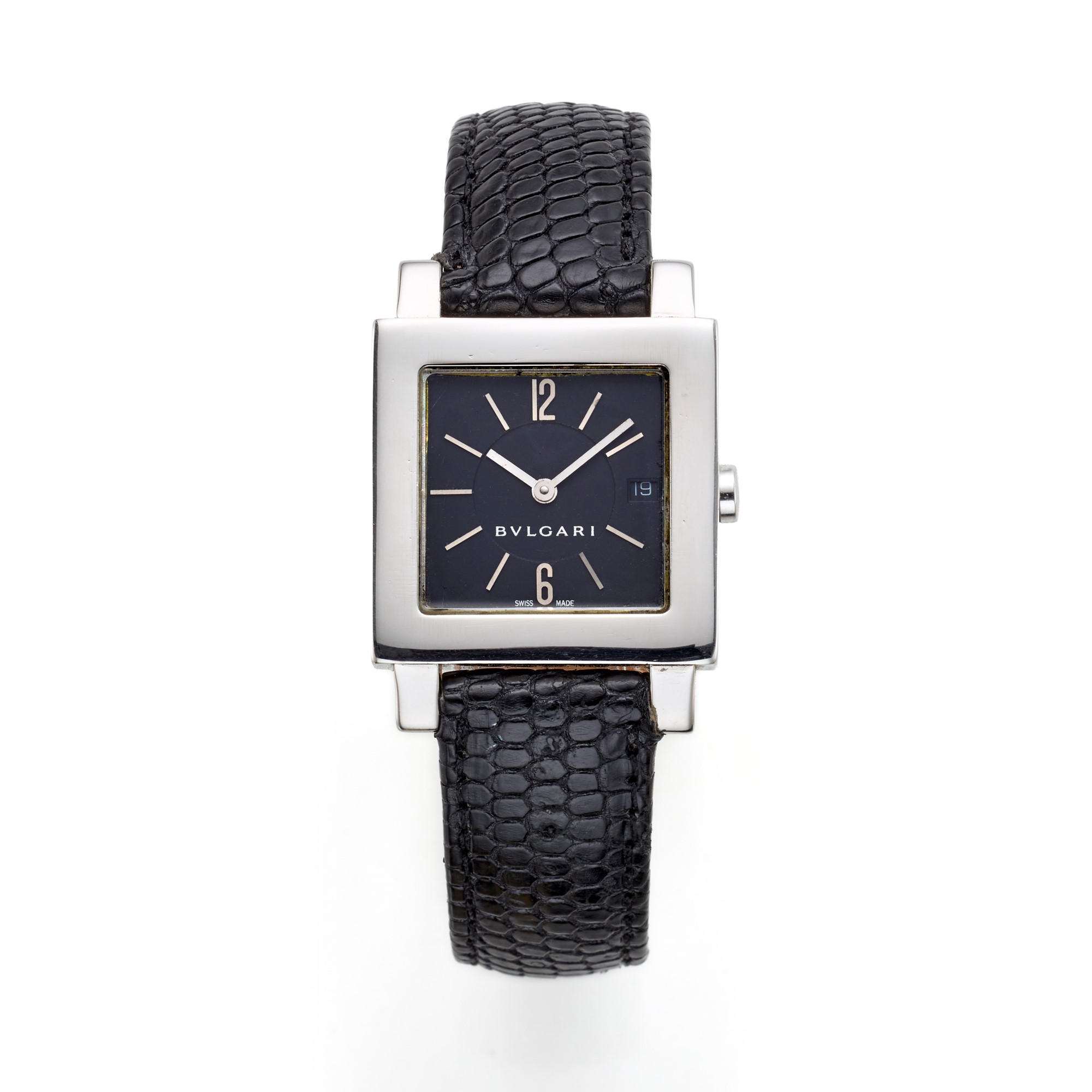Bulgari Quadrato, ref. BB 33 GL, year 2000. Stainless steel case, with black leather strap and pin buckle. Quartz movement. Dial, movement and case signed. Good overall condition.