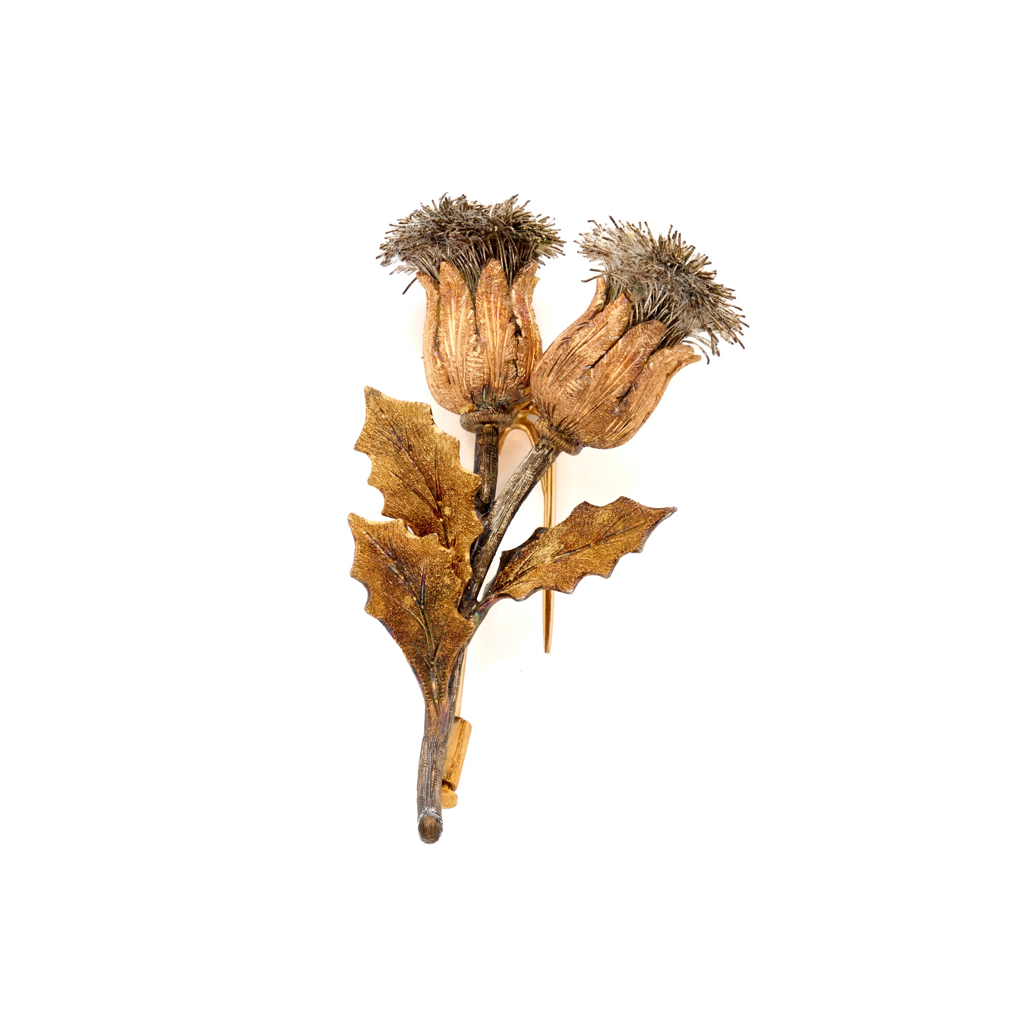 18 Kt yellow and pink gold and silver thistle brooch signed Federico Buccellati.