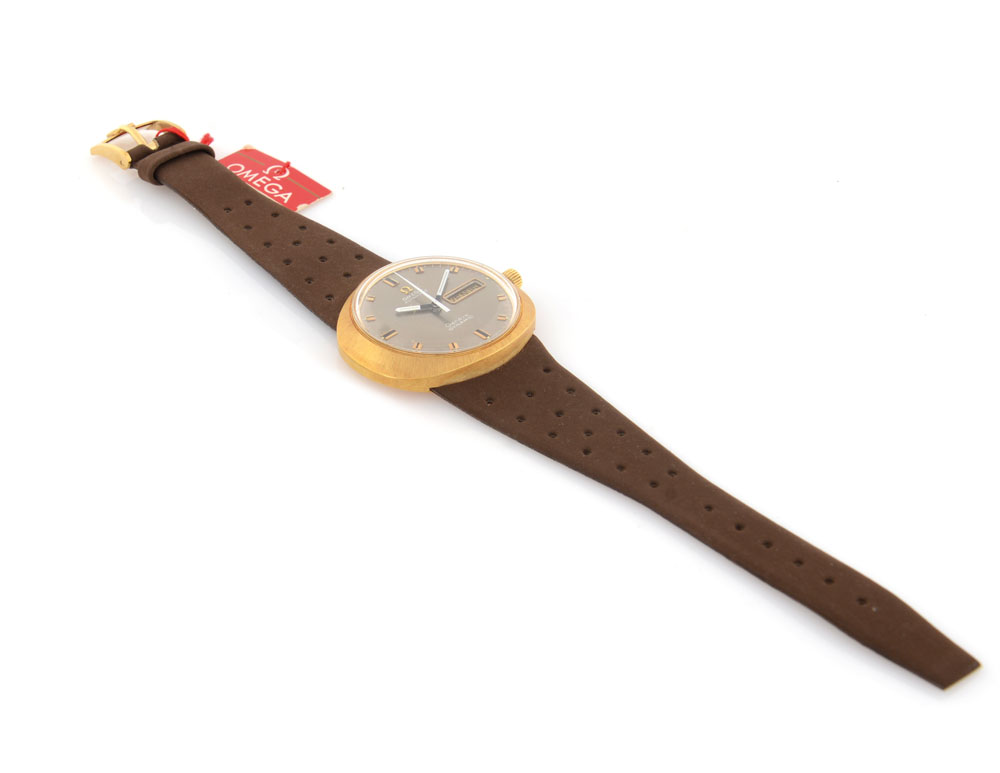 Diam. mm 41. C. 18 kt yellow gold, screwed case back (new old stock). D. grey with applied indexes, centre seconds and aperture for day and date at 3 (very good). M. self-winding (very good). Dial, case and movement signed. Accompanied by Omega strap, buckle and tag sale.