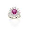 18 Kt white gold ring with a central 2,75 ct cushion ruby surrounded by round and navette diamonds totalling approximately 2.50 ct