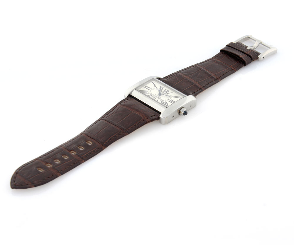 Dim. mm 38x30. C. rectangular, stainless steel with case back secured by screws, sapphire crystal (very good). D. silvered soleil with painted Roman numerals and centre seconds (as new). M. self- winding (very good). Dial, case and movement signed. Accompanied by Cartier strap and stainless steel buckle.